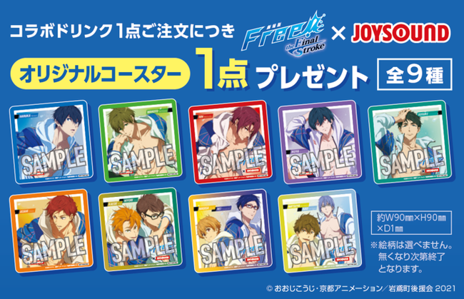 コラボドリンクは、「劇場版 Free!-the Final Stroke-」のキャラクター「七瀬遙」「橘真琴」「松岡凛」「桐嶋郁弥」「山崎宗介」「椎名旭」「遠野日和」「葉月渚」「竜ケ崎怜」をイメージした全9種をご用意します。注文特典として、コラボドリンク1品ご注文につき、オリジナルコースター【全9種】の中からランダムで1枚プレゼントします。JOYSOUND直営店10店舗限定で、ドリンクテイクアウトも実施!