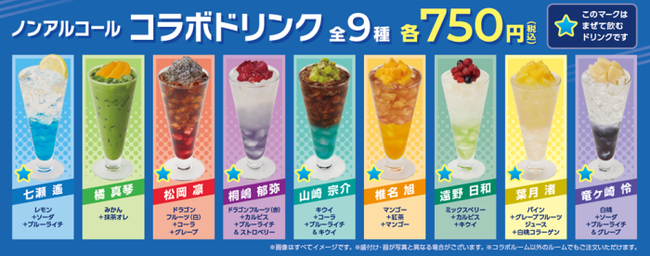 コラボドリンクは、「劇場版 Free!-the Final Stroke-」のキャラクター「七瀬遙」「橘真琴」「松岡凛」「桐嶋郁弥」「山崎宗介」「椎名旭」「遠野日和」「葉月渚」「竜ケ崎怜」をイメージした全9種をご用意します。