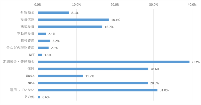 →現在、実施している資産運用の種類は「定期預金・普通預金」(39.3%)、「運用していない」(31.0%)に次いで、「保険」(28.6%)と「NISA」(28.5%)が上位に