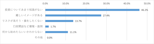→資産形成・資産運用をしていない理由は、「投資についてあまり知識がない」(46.2%)、次いで「難しいイメージがある」(27.4%)と、知識や経験不足が資産形成を始める壁となっていることが明らかに