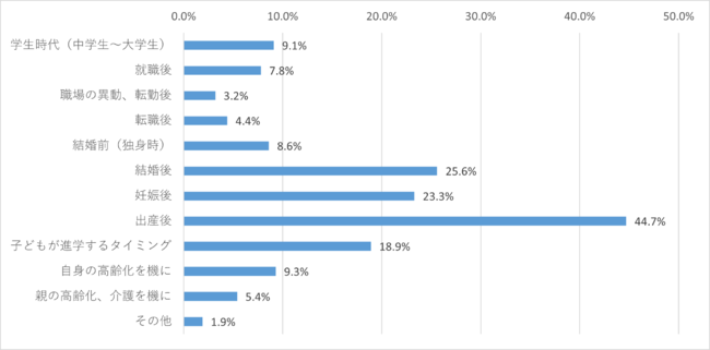 →「楽天ママ割」メンバーが、将来のお金、教育資金や老後資金に関して最も不安に感じたタイミングは「出産後」(44.7%)