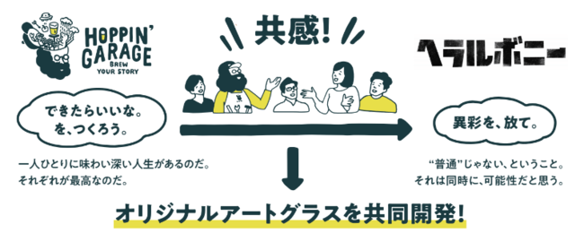 今回、『できたらいいな。を、つくろう。』をブランドメッセージに掲げ、共創によるビールづくりを手掛ける「HOPPIN' GARAGE」 と、『異彩を、放て。』をミッションに掲げる(株)ヘラルボニー(以下、ヘラルボニー)は、「個性」や「多様性」を社会に拡げる取り組みを行っており、両社の価値観を融合させた初めてのコラボレーションが実現しました。