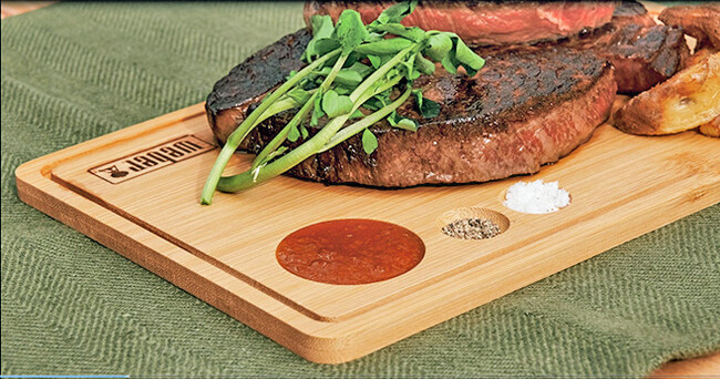 表面のトレーは3種類のタレ&スパイスを入れられる凹み付き。こんがり焼いたステーキをお好みのスパイスで味変すれば食も進む!