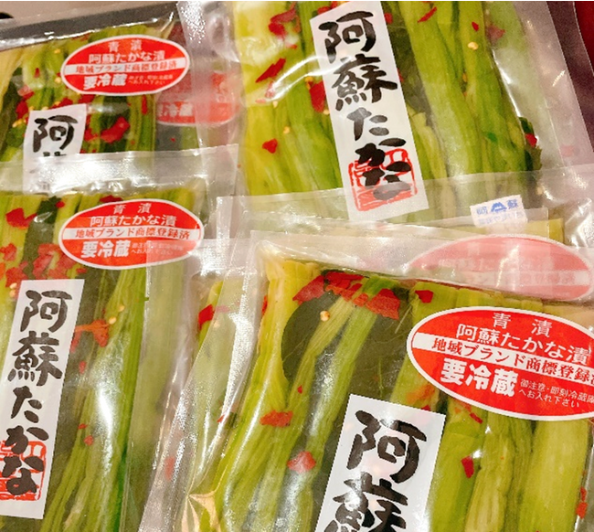 阿蘇高菜は、熊本県阿蘇地方でしか採れない、阿蘇を代表する農産物。特産の「阿蘇たかな漬け」は 、塩漬け(一次漬込み)製法で一味違った高菜漬けです。地域で世代を超えて受け継がれてきた食文化を、100年続く食文化「100年フード」と名付け、文化庁とともに継承していくことを目指す取組に選ばれています。