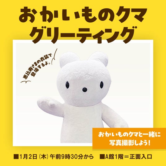 新春初売りにお越しいただいたお客さまをおかいものクマがお出迎えいたします。一緒に写真撮影をしていただけます。また、ご来店いただきました先着1,000名さまに鎌倉 銭洗弁財天宇賀福神社の銭洗水で清めたお福銭をプレゼントいたします。