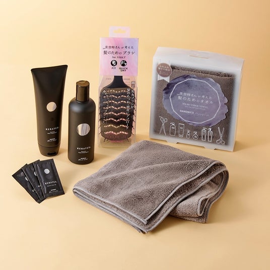 ケラテックス ファイバーシャンプー(300ml)・ケラテックス ファイバー トリートメント(250g)・ホグレール(ヘアブラシ)・ケラテックス ファイバー オイルサッシェ(2ml×3包)・ヘアドライマイクロファイバータオル(セサミ×2)