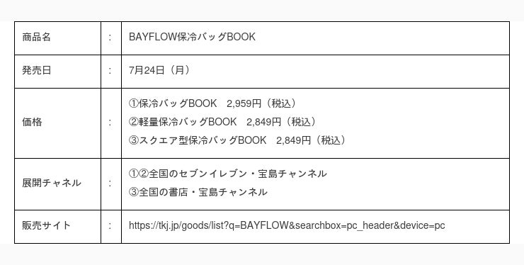 BAYFLOW保冷バッグBOOKの「保冷バッグ」と「軽量保冷バッグ」は全国のセブンイレブンにて、「スクエア型保冷バッグ」は全国の書店にて、7月24日(月)よりお買い求めいただけます。