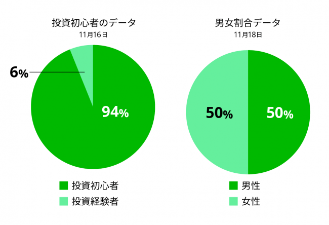 『ワンコイン投資』の大幅リニューアル後、投資初心者の割合が日別最大で約95%*1にのぼりました。金融業界では、投資・資産運用初心者の利用促進が課題とされておりましたが、本結果により解決の兆しが見えてきました。更にこれまでの金融業界において投資経験者の多くを男性の利用が大きく占めていると考えられてきましたが、女性利用者の割合は日別で最大約50%*2までのぼり、女性のお客様にも気軽に投資をお楽しみいただける仕様となりました。