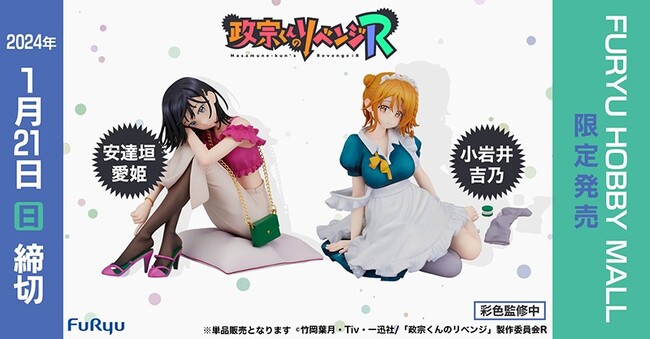フリュー株式会社(本社:東京都渋谷区、代表取締役社長:三嶋隆、以下フリュー)は、TVアニメ『政宗くんのリベンジR』より『安達垣 愛姫 ノンスケールフィギュア』と『小岩井 吉乃 ノンスケールフィギュア』の発売を決定したことをお知らせします。本日9月25日(月)より、フリューが運営するホビーECサイト『FURYU HOBBY MALL(フリューホビーモール)』(URL:https://furyu-hm.com/)にて予約が可能です。