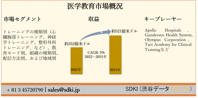 医学教育市場は、2022年に約352億米ドルの市場価値から、2031年までに約521億米ドルに達すると推定され、2022-2031年の予測期間中に5%のCAGRで成長すると予想されています。