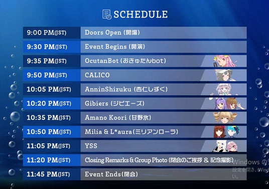 「くらげJack」は、バーチャル音楽フェスとして「VRChat」や「cluster」で話題の「くらげビート」との共同開催です。くらげビート主宰のおきゅたんbotをはじめ、YSS、杏仁しずく、ジビエーズなど計7組が初夏を華々しく彩る一大イベントです。