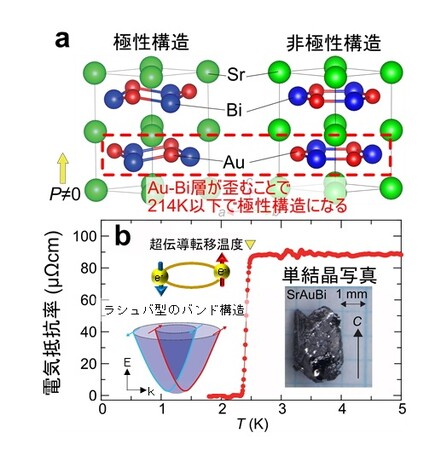 最近、研究グループは、極性-非極性相転移を持つSrAuBiという化合物が超伝導を示すことを発見し、極低温の物性測定や理論計算により、特殊な超伝導状態が実現している可能性を見いだしました。このSrAuBiは、ビスマスや金といった重元素からなる極性構造を有しており、さらに、トポロジカルなバンド構造に由来した表面状態の存在から、標準理論では説明のつかない超伝導が実現している可能性があります。