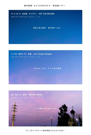 そしてこのアルバム発売に合わせて「西片梨帆 まどろみのひかり 東名阪ツアー」が開催決定した。11月3日に名古屋ギャラリーOFF THE RECORDにて写真の詩の展示と弾き語りLIVE、11月22日に大阪Live House Pangeaにて3マンLIVE、そして12月9日は東京・新代田FEVERにてバンド編成でのワンマンLIVEが行われる。プレイガイドでのチケット発売は10月2日(土)10時からの予定。
