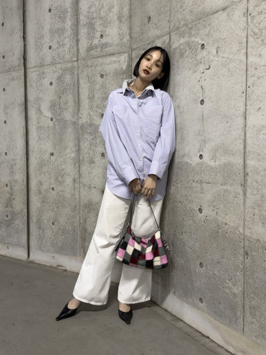色の違うストライプシャツを合わせて、シンプルだけど遊び心があるスタイリングに。
