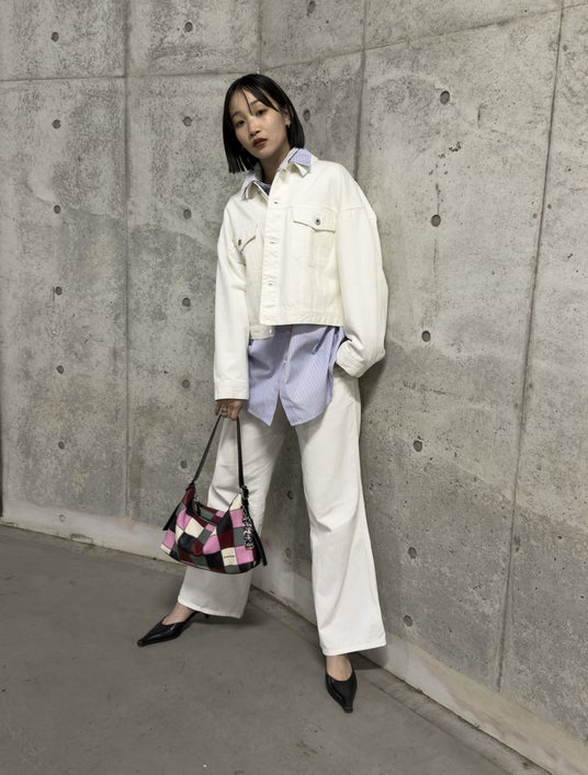 アウターはホワイトのデニムジャケットで春らしく。