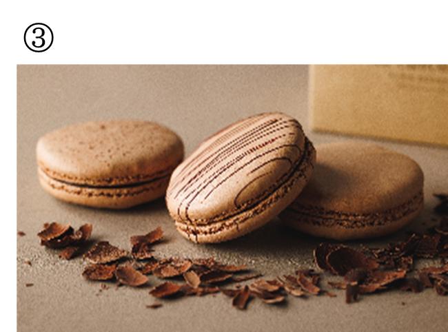 3.厳選されたカカオの香りと味わいをお楽しみいただける人気の大きなマカロンショコラ。インド産カカオ75%、ホンジュラス産カカオ75%、エクアドル産カカオ75%を使用したガナッシュ3種。