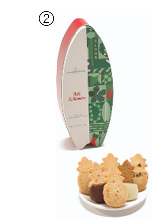 2.サーフボード型のギフト缶には、3種類のシグネチャー・フレーバーと、ペパーミント・マカデミア、ダーク・チョコレート・ペパーミント・マカデミアとホワイト・チョコレート・ジンジャー・スパイスのホリデー限定フレーバー3種類のショートブレッド・クッキー15枚が入っています。