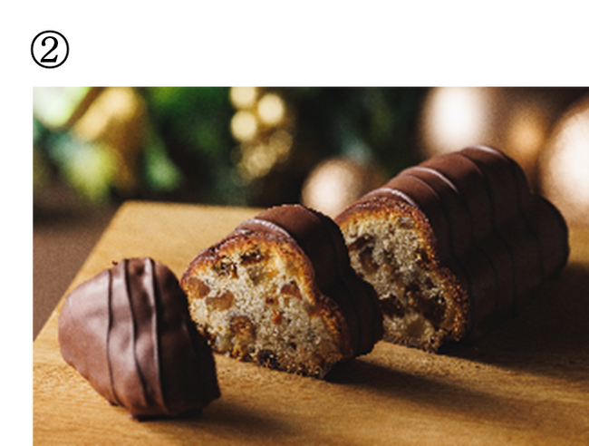 2.フランスコルシカ島ソヴェリア村のオレンジやシトロンのコンフィ、香ばしいアーモンドなどがたっぷり入った生地を風味豊かなショコラ オ・レでコーティングしたシュトーレン。