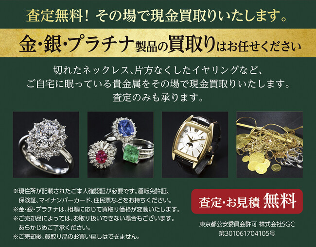 ご自宅に眠る貴金属の買取りをいたします。切れてしまったネックレス、壊れたままの指輪、片方だけになったイヤリングなど、その場で買取りいたします。お気軽にご相談ください。※貴金属の買取りには現住所が記載されたご本人確認証が必要です。(東京都公安委員会許可 株式会社SGC 第301061704105号)