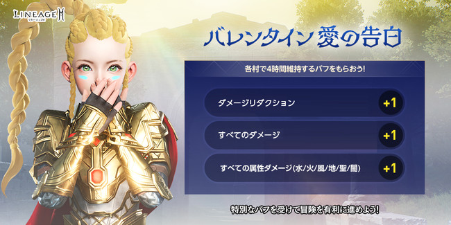 期間中、毎日正午にゲーム内郵便にて「アインハザードの祝福」や「バレンタインの愛の証(イベント)」「成長ポーション(10%)(イベント)」「ルーンスト―ン(刻印)」をお送りします。