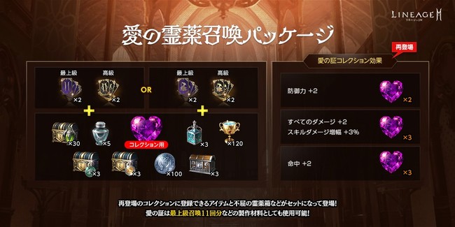 クラス、またはアガシオンの召喚44回分に、「不屈の霊薬箱(刻印)」30個や「熟練度ボーナスコイン(刻印)」100個、「愛の証(刻印)」などがセットになった「愛の霊薬召喚パッケージ」が登場しました。