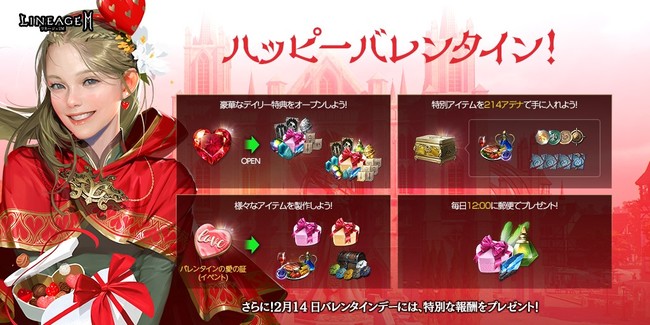 期間中、ゲーム内の「ショップ」にてアカウントにつき1日1回、214アデナを使用することで交換可能な「バレンタイン サプライズ箱(イベント)」が登場します。