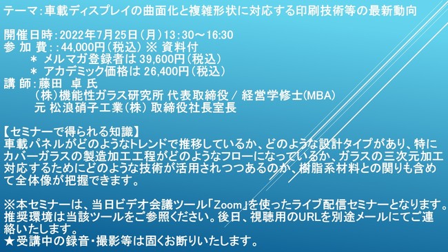 先端技術情報や市場情報を提供している(株)シーエムシー・リサーチ(千代田区神田錦町: https://cmcre.com/ )では、 各種材料・化学品などの市場動向・技術動向のセミナーや書籍発行を行っておりますが、 このたび「車載ディスプレイの曲面化と複雑形状に対応する印刷技術等の最新動向」と題するセミナーを、 講師に藤田 卓 氏 (株)機能性ガラス研究所 代表取締役 / 経営学修士(MBA) 元 松浪硝子工業(株) 取締役社長室長)をお迎えし、2022年7月25日(月)13:30より、 ZOOMを利用したライブ配信で開催いたします。 受講料は、 一般:44,000円(税込)、 弊社メルマガ会員:39,600円(税込)、 アカデミック価格は26,400円(税込)となっております(資料付)。
