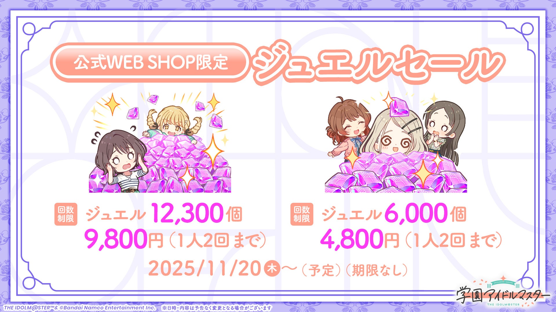 ジュエルをお得に購入できる、『学園アイドルマスター 公式WEB SHOP』のオープンが、2025年11月20日(木)に決定いたしました!