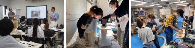 2回目の開催となる今回は、夏休みの集中授業として学科の垣根を越えた19名の学生が授業に参加しました。学生たちは初回の授業で「ストアVMD(※)」の基礎を学び、店舗づくりの基礎を勉強したうえで、リアルな仕事のプロセスになぞらえ、企業の仕事を受注した流れと同じように商品陳列用の什器製作を行っています。このたびの什器製作では、素材となる樹脂の成型過程から行いました。また、陳列商品に添える装飾品としてサステナブルな素材として近年注目される「paneco」を用いて食材や調理器具をテーマにした立体造形に挑戦しています。