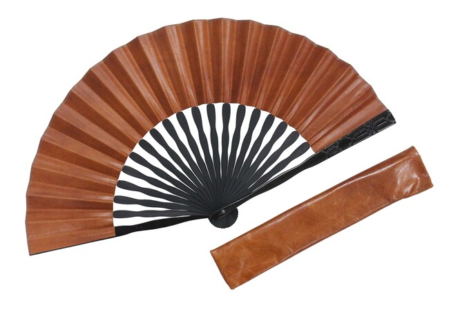 一枚一枚手染めで濃淡を付けた牛革を使用したシックな風合いが漂う扇子。彫加工を施した塗りの親骨と、オイルを使用した上質な光沢の扇面が高級感を演出しています。