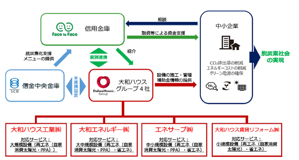 今後、本連携協定に基づき、信金中金および大和ハウスグループ4社が連携し、各信用金庫を通じて、中小企業に対して再生可能エネルギー電源や省エネルギー設備をはじめとした脱炭素設備の導入をサポートすることで、脱炭素社会の実現に貢献してまいります。信金中金は信用金庫に脱炭素化支援メニューの提供を行い、各信用金庫は大和ハウスグループ4社と連携していく予定(※1)です。