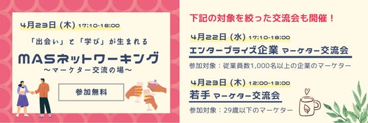 そこで本展では、マーケターのための交流会「MaSネットワーキング」を開催。エンタープライズ企業向け、若手向け、全マーケター向けに加え、CMOクラス限定の少人数ラウンドテーブルも用意し、課題整理から“次の一手”までを加速するつながりを提供します。