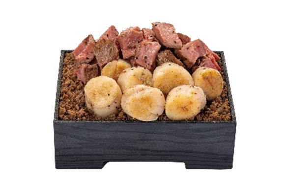 北海道産牛赤身ロースと焼き帆立をたっぷり盛り付けたお弁当。