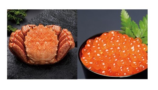 (左)札幌〈北円山まるしぇ〉茹毛がに(冷凍・一杯600g) 8,000円、(右)函館〈山丁長谷川商店〉北海道産いくら醤油漬(100gあたり) 2,376円