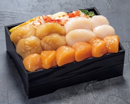 赤玉ホタテ、醤油漬け・刺身のホタテ食べ比べとタラバガニのほぐし身を盛り付けた北海道産弁当。