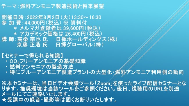 先端技術情報や市場情報を提供している(株)シーエムシー・リサーチ(千代田区神田錦町: https://cmcre.com/ )では、 各種材料・化学品などの市場動向・技術動向のセミナーや書籍発行を行っておりますが、 このたび「燃料アンモニア製造技術と将来展望」と題するセミナーを、 講師に高桑 宗也 氏 日揮ホールディングス(株) 京藤 正浩 氏 日揮グローバル(株))をお迎えし、2022年8月2日(火)13:30より、 ZOOMを利用したライブ配信で開催いたします。 受講料は、 一般:44,000円(税込)、 弊社メルマガ会員:39,600円(税込)、 アカデミック価格は26,400円(税込)となっております(資料付)。