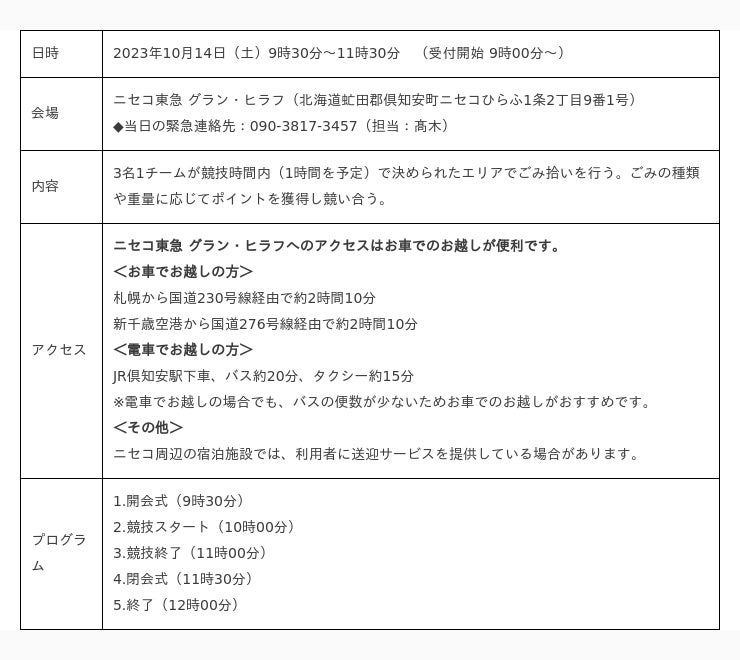 一般社団法人SOCIAL GOOD ENTERTAINMENT(代表:高木光治)とNaia合同会社(代表:猪狩文孝)は、3人1組のチームを結成し、制限時間60分の中で規定エリア内のごみを拾い、その質と量をポイントで競う『海と日本PROJECT スポGOMI in ニセコ』を10月14日(土)に開催いたします。『海と日本PROJECT スポGOMI in ニセコ』は、仲間と楽しみながらごみ拾いをすることで、町や海のごみ問題を自分ごと化としてとらえていただくことを目的に、日本財団が推進する海洋ごみ対策プロジェクト「海と日本プロジェクト・CHANGE FOR THE BLUE」の一環で開催するものです。