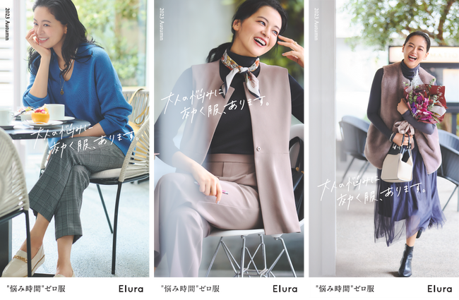 株式会社アダストリア(本部:東京都渋谷区渋谷2-21-1、代表取締役社長:木村 治)が展開する「大人女性の悩みに効く」ブランドElura(エルーラ)が、2023年8月18日(金)より2023年秋ビジュアルを公開。女優としてドラマやバラエティ番組など幅広く活躍する黒谷友香さんに、「“悩み時間”ゼロ服」をコンセプトに、朝、服に悩む時間・お手入れする時間・着心地を我慢する時間・・・など大人女性が服に対して持つ些細なストレスから解放される姿を表現いただきました。