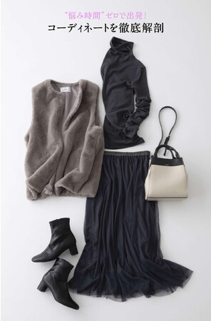 人気継続中のエコファーベストは、羽織るだけで一気に「よそゆき感」が生まれる便利なアイテム。ダークトーンで揃えて、ボア×ファーのカジュアル感を中和すると◎。