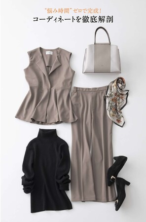 大人の肌をくすませない上品なベージュは貴重な存在!一日中着ても疲れないリラクシー素材のセットアップは、スタイリング要らずなのに、オフィスでも好印象間違いなしです。