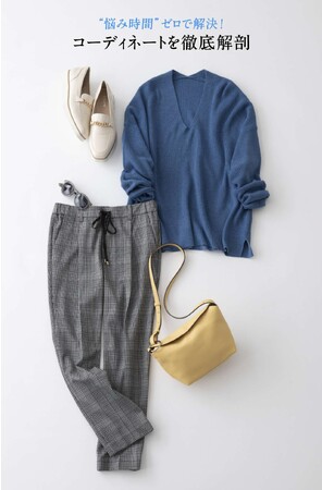 着るだけでデコルテや後ろ姿に美しい抜け感が生まれるニットは、大人の女性の肌の透明感を引き出す絶妙なブルーもポイント。長時間履いても疲れないチェックパンツで一日中ご機嫌に!