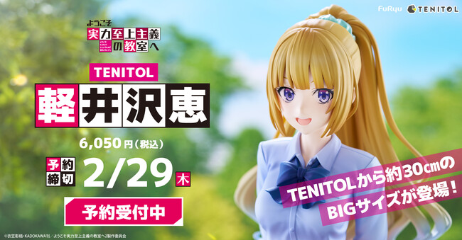 フリュー株式会社(本社:東京都渋谷区、代表取締役社長:三嶋 隆、以下フリュー)は、自社が手掛ける“お手頃価格”なフィギュアブランド『TENITOL(テニトル)』の新商品として、TVアニメ「ようこそ実力至上主義の教室へ」より『TENITOL 軽井沢恵[BIG]』の発売を決定いたしました。本日1月18日(木)より、フリューが運営するホビーECサイト『FURYU HOBBY MALL(フリューホビーモール)』(URL:https://furyu-hm.com)ほかにて予約開始いたします。