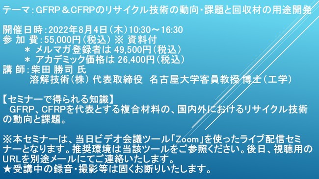 先端技術情報や市場情報を提供している(株)シーエムシー・リサーチ(千代田区神田錦町: https://cmcre.com/ )では、 各種材料・化学品などの市場動向・技術動向のセミナーや書籍発行を行っておりますが、 このたび「GFRP&CFRPのリサイクル技術の動向・課題と回収材の用途開発」と題するセミナーを、 講師に柴田 勝司 氏 溶解技術(株) 代表取締役 名古屋大学客員教授 博士(工学))をお迎えし、2022年8月4日(木)10:30より、 ZOOMを利用したライブ配信で開催いたします。 受講料は、 一般:55,000円(税込)、 弊社メルマガ会員:49,500円(税込)、 アカデミック価格は26,400円(税込)となっております(資料付)。