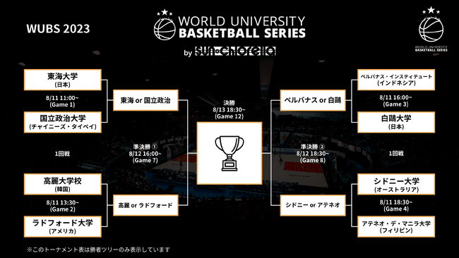 出場校は、山崎 一渉選手が所属する米国のラドフォード大学、インドネシアのペルバナス・インスティテュート、オーストラリアのシドニー大学、韓国の高麗大学校、チャイニーズ・タイペイの国立政治大学(NCCU)、「第74回全日本大学バスケットボール選手権大会」の優勝校と準優勝校である日本の東海大学と白鷗大学、そして「WUBS」第1回大会の優勝校であるフィリピンのアテネオ・デ・マニラ大学が参加します。今大会では、8月11日(金)から13日(日)の3日間で計12試合のノックアウトトーナメント方式にて試合を行い、シリーズチャンピオンを決定します。また、8月10日(木)には「Opening Night」(仮称)として、バスケットボール男子 日本学生選抜(JUBF選抜)とアテネオ・デ・マニラ大学によるエキシビションマッチを実施します。