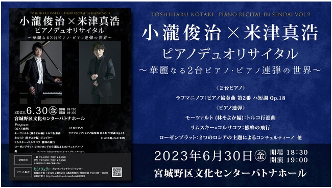 『小瀧俊治 × 米津真浩 ピアノデュオリサイタル ~華麗なる2台ピアノ・ピアノ連弾の世界~』が2023年6月30日(金)に宮城野区文化センター パトナホール(宮城県仙台市宮城野区五輪2丁目12番70号)にて開催されます。