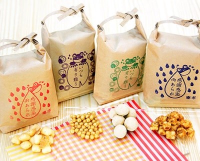「粋あられ」をはじめ、豆菓子の「つぶ玉」、もちあげの「よいしょ」などが登場。かわいいスタンプ柄のパッケージはプレゼントにもおすすめです。