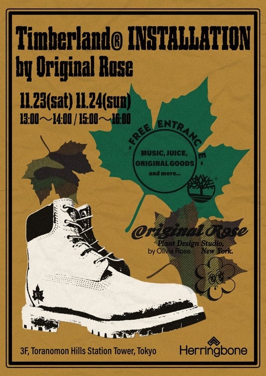 2024年11月23日(土)、11月24日(日)に「Herringbone Footwear ヘリ ンボーンフットウェア」と「THE STAND fool so good(s)」にて、「ティンバーランド(Timberland)」を代表 する「6インチ プレミアム ウォータープルーフブーツ(通称:イエローブーツ)」のヒールにティンバーラ ンドのツリーロゴとOriginal Roseロゴを刻印したイエローブーツを展開。