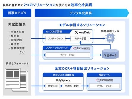 トランスコスモス株式会社(本社:東京都豊島区、代表取締役共同社長:牟田正明、神谷健志、以下、「トランスコスモス」)とAI inside 株式会社(代表取締役社長CEO:渡久地 択、本社:東京都渋谷区、以下「AI inside」)は、トランスコスモスが提供する最新のテクノロジーと専門的な業務知見を融合したDigital BPO(R)と、AI inside が提供する最先端のAI技術を組み合わせ、非定型帳票のデータ処理の効率化に向けたソリューションを提供します。