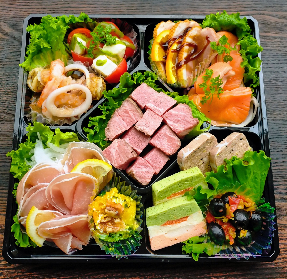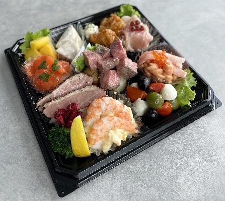 ローストビーフをはじめとした肉惣菜と海の幸をバランスよく盛り付けたオードブルです。