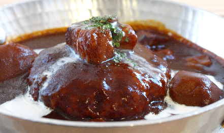 国産豚肉牛肉を使用したハンバーグにビーフシチューをかけました。